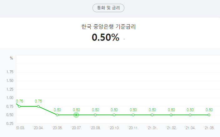 오늘 한은이 만장일치로 기준금리를 현 수준인 0.50%로 동결한다고 한다. 통화 정책 완화 기조를 유지 및 확대한 것이다. 작년 코로나로 인해 7,8,10,11월 동결 이후 올해도 벌써 1,2,4월 동결했다. 이번 동결은 코로나 전개에 대한 불확실성을 이유로 보고 있다. 우선 한국은행은 경제성장률 전망치를 4%로 1%p올렸는데 낙관 시나리오를 따르는 것으로 보인다.