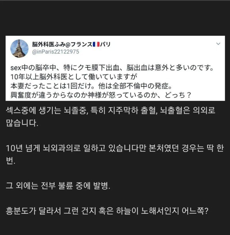 - 19세기 프랑스 작가 알렉상드르 뒤마는 젊은 여성과 합의하에 성관계를 하다가 심장마비로 사망했다고 한다.