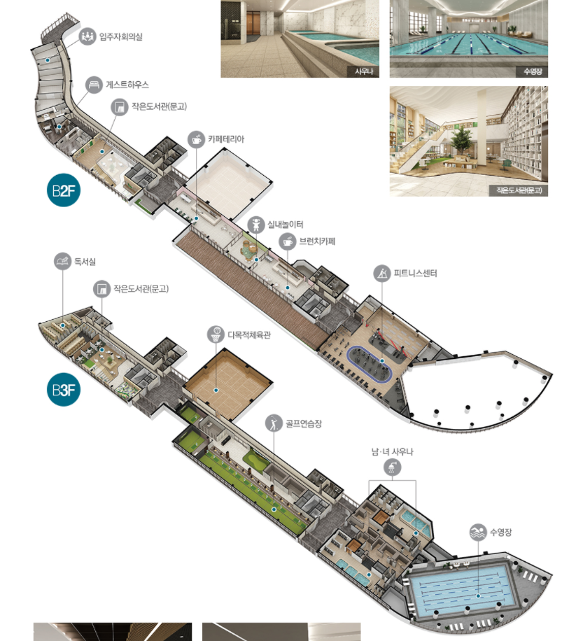 커뮤니티로는 실내놀이터, 맘스테이션, 돌봄센터, 도서관, 독서실, 피트니트센터, 수영장, 골프연습장, 체육관, 사우나, 카페테리아, 게스트하우스