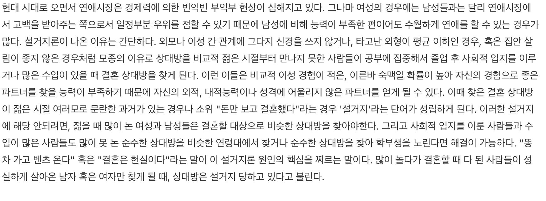-장기연애 자체가 일방적인 희생으로는 결코 이루어질 수 없고 서로 밀고 당기고 양보하고 양보 받으면서 이루어졌기 때문에 한쪽만 희생한다는 설거지론과는 거리가 있음. 그런데 이게 그렇게 흔한가? 우리학교 150명 동기 중 오랫동안 연애해서 결혼까지 한 커플은 3명 정도 있음(동기CC만 세지 않고 외부인과 사귄거 모두 포함)