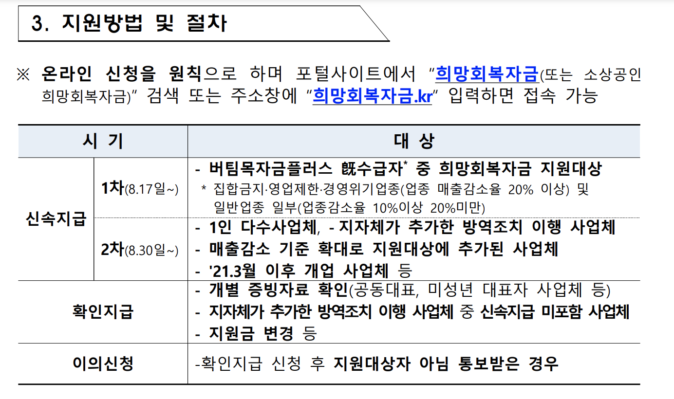 소상공인 희망회복자금의 1차 신속지급 대상은 8월 17일 08시부터 신청가능하다. 2차 신속지급은 8월말, 별도 서류제출이 필요한 확인지급 신청은 9 월말 예정이며 별도 안내한다고 한다. 8.17일 시작되는 1차 신속지급 및 이후 2차 신속지급과 확인지급은 모 두 희망회복자금 전용 온라인 누리집(희망회복자금.kr)에서 신청할 수 있다고 한다.