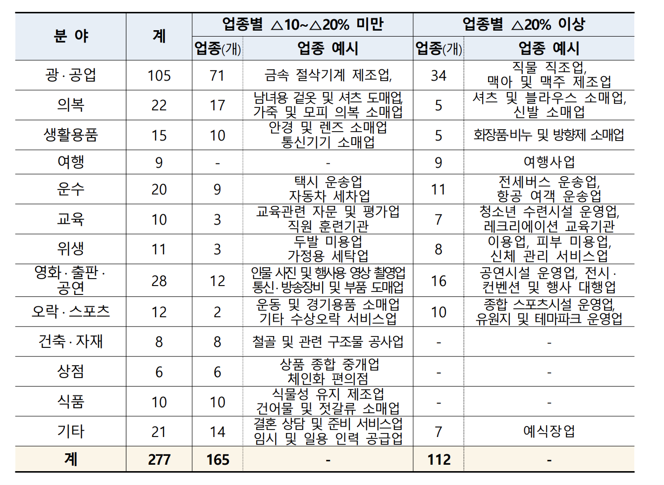 정부는 매출 감소 정도에 따라 업종을 구분하여 차등적으로
