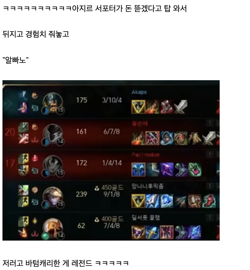 파카 유튭에서 서폿아지르 유저가 저거로 돈뜯으니까 다른 유저가 "그거 경험치 들어가는거 아님?" 물어봤는데 "알빠노" 박음