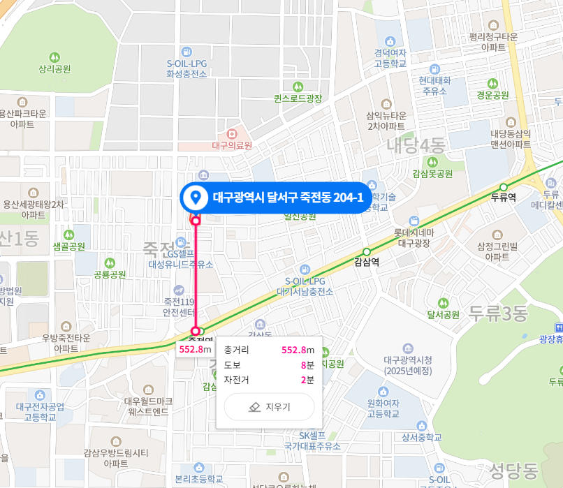 단지 특징은 대구지하철 2호선 죽전역세권이고, 대단지로 동간 거리가 넓은 것이 특징이다.