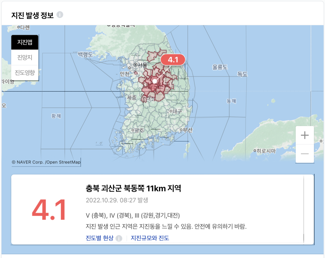 오늘 오전에 충북에서 진도 4.1 규모의 지진이 일어났다. 못 느낀 사람이 더 많지만 재나눈자 알람에 크게놀란 사람들이 많았다고 한다.