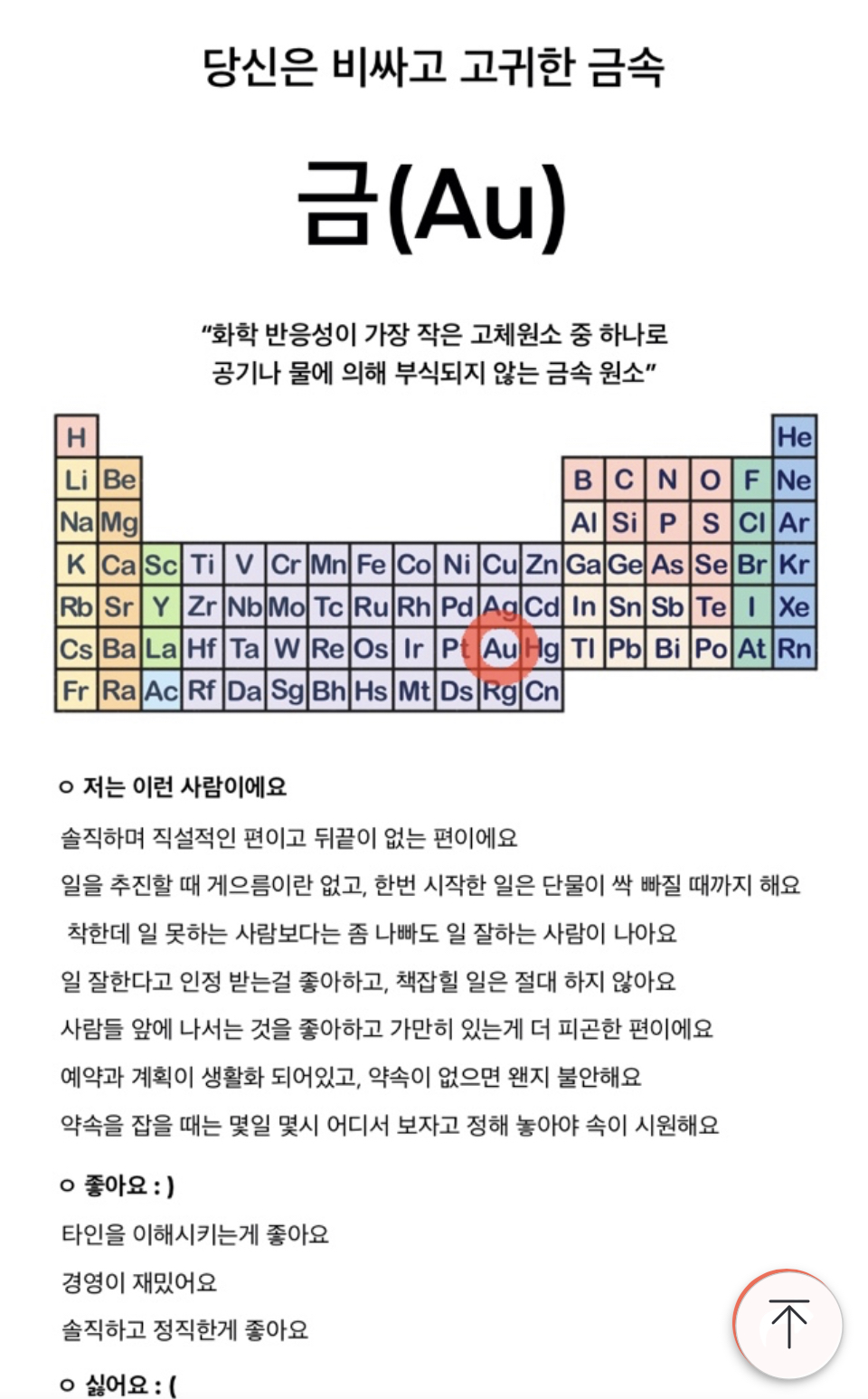 나랑 닮음 화학원소 찾기 테스트는 아래에서 가능하다. mbti랑 약간 비슷한 테스트 같다.