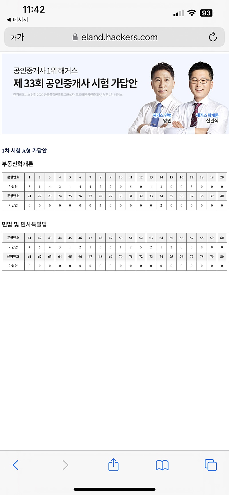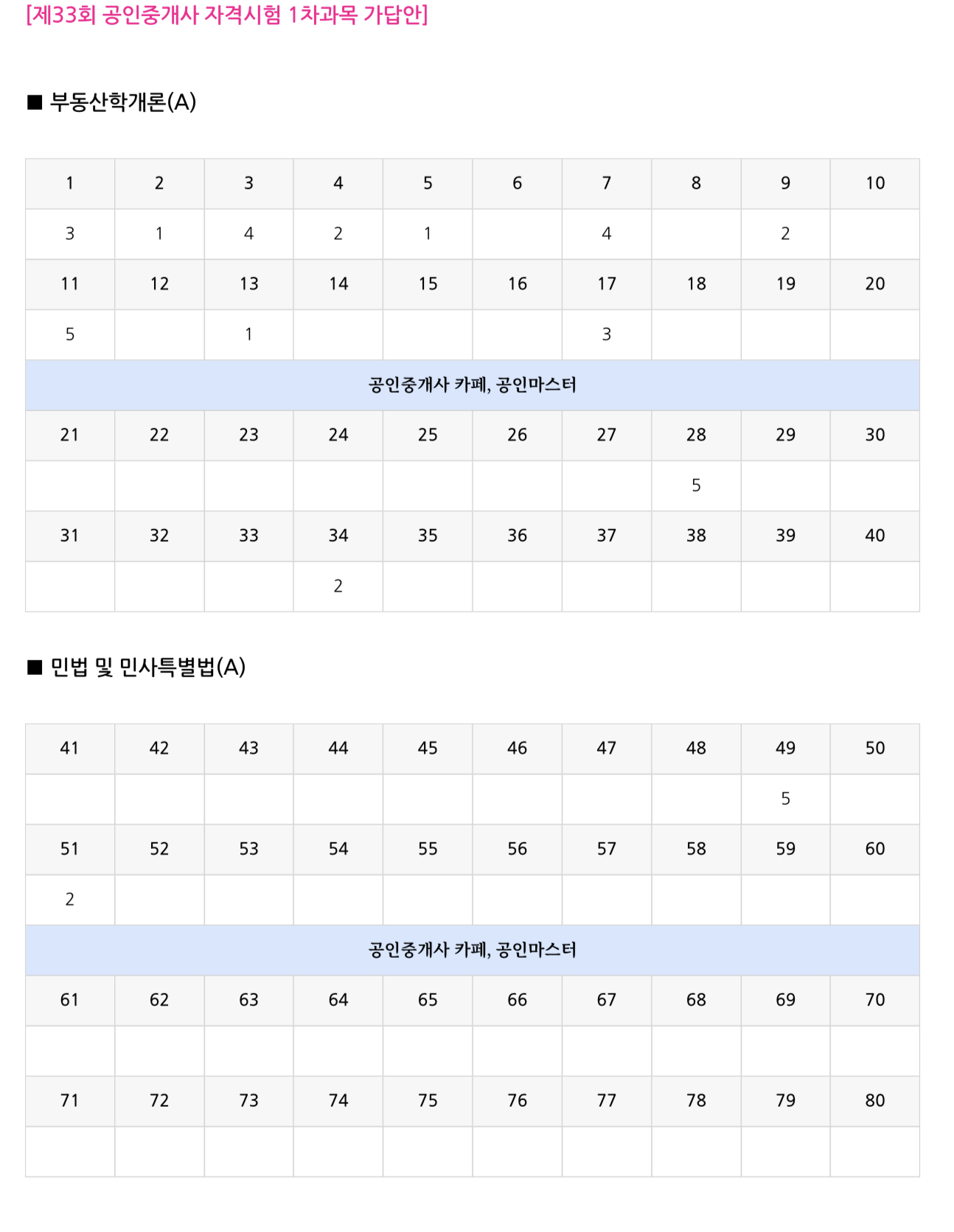 공인중개사 33회 가답안이 공개되었다. 1차 시험은 어렵고 지엽적으로 출제되었다는 평이 많았고, 계산문제도 챙겨야 좋았다고 한다. 기출을 계속 보는 방식보다 개념서를 함께 봐야 좋았다고 한다. 특히 공법은 역대급 문제 난이도로 엄청나게 욕을 먹는 중이다. 학원 모의고사로 커버 안되는 수준이라 한다.