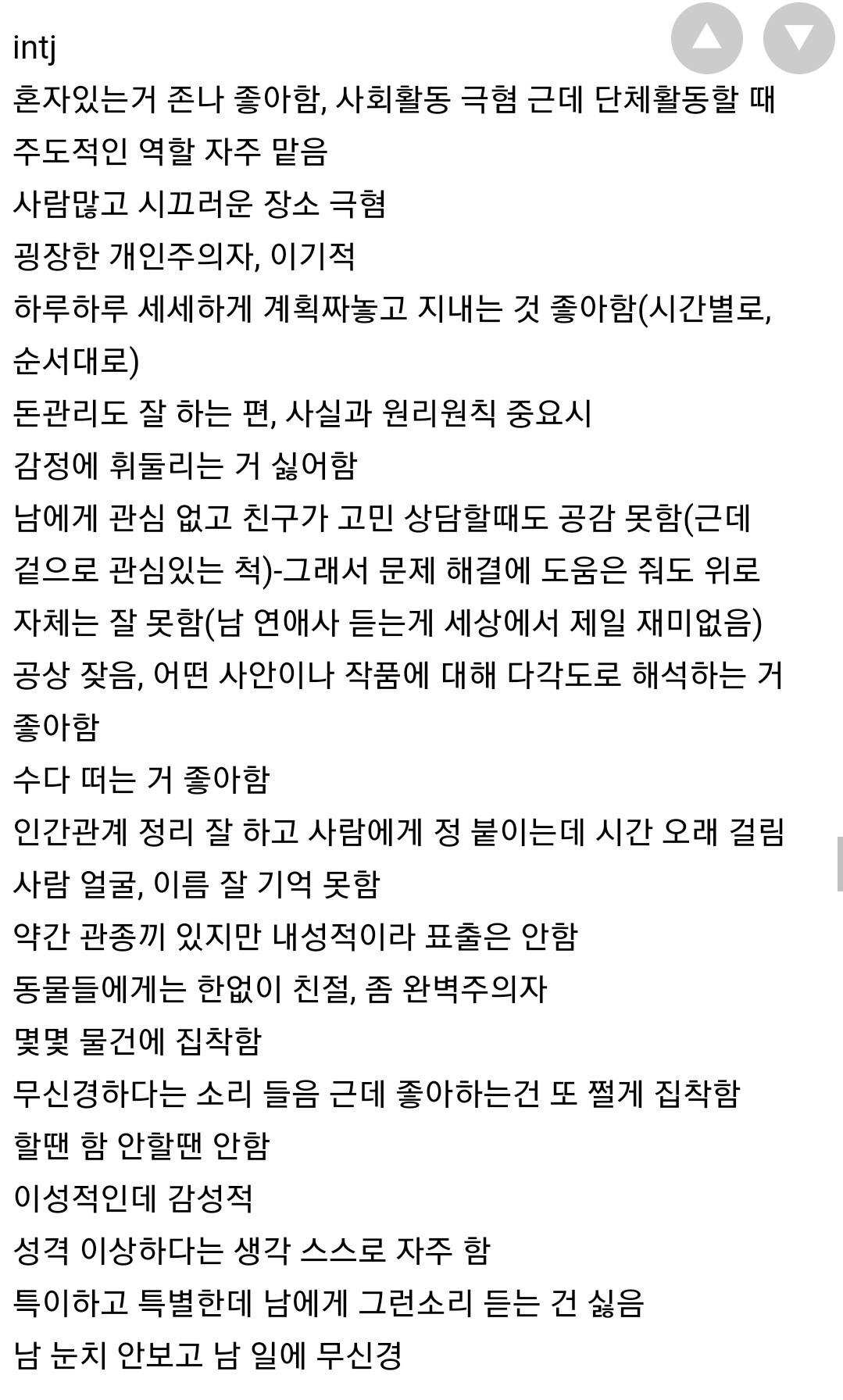 저 인트제인데요. 정말 정확하게 다 맞는 것 같아요. 지적인 사람을 좋아하는 것, 지적인 대화를 좋아하는 것, 마음의 벽이 높다는 것, 다만 그 벽 안으로 들어온 사람에게는 너무나도 따뜻한 사람이라는 거. 이렇게 놓고 보니 저의 성격이 무엇인지 보다 명확해 진 것 같네요. 그리고 저의 단점 역시 명확하게 보입니다. 보다 더 긍정적인 방향으로 바뀌기 위해 노력할 수 있을 것 같아요. 좋은 영상 감사합니다.간략히
