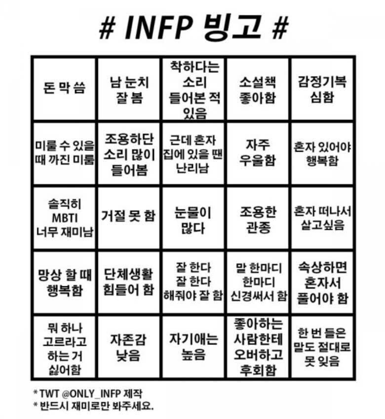 INFP는.. 호구라고 생각할 수도 있는데 아직 폭발한 적이 별로 없어서지 늬들이 생각할 정도로 개호구 아님. INFP는 그냥 자기 힘듦을 넘어서기 전까지 오지게 참고 봐주는 거지 한번 터지면 관계를 끊거나 선을 긋는 게 아니라 관계를 그냥 아예 없애버림 ㄹㅇ