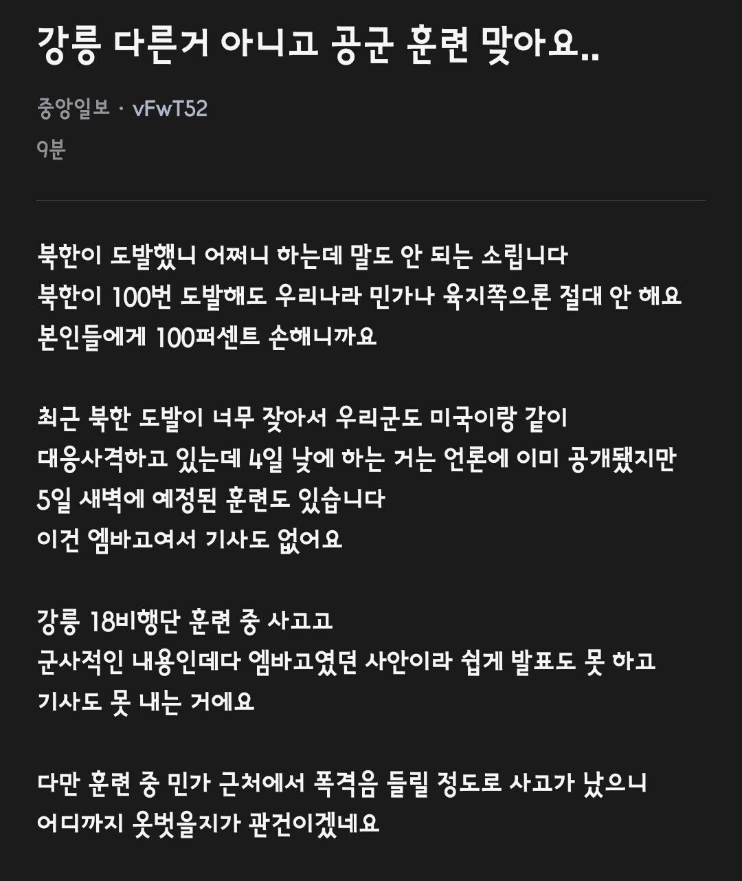 북한의 미사일 도발에 대해 우리 군과 주한미군이 미사일 대응을 했다. 이 때 발사한 현무미사일 중 1발이 낙탄되었다. 이에 강릉 시민들 중 다수가 새벽에 깨서 잠을 설치고 불안해 하였다. 이에 대해 오늘 아침까지 엠바고가 걸려있다가 언론 보도를 타게 되었다고 한다.